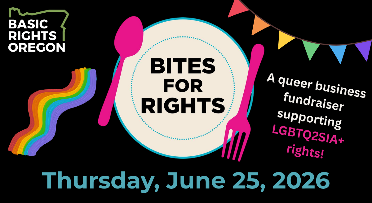 Bites for Rights is back again! Join us for a one-day pride season fundraiser to help us protect and defend LGBTQ2SIA+ rights for all Oregonians! Participating small businesses will donate a portion of their proceeds to Basic Rights Oregon on June 25th.