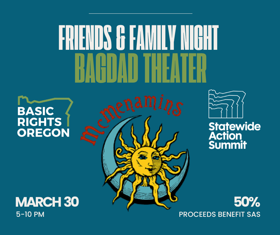 Join us Monday, March 30th 5 to 10 p.m. at McMenamins Bagdad Theater & Pub for a friends and family night benefiting BRO! Half of the night’s proceeds will go towards our Statewide Action Summit, which allows us to offer discounted tickets to BIPOC and trans community members.
